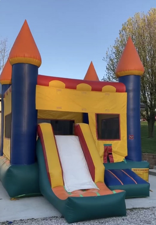 This colorful combo bouncer with slide measures 17 L x 13 W x 15 H. The slide is an added bonus and the inflatable is perfect still for any age!