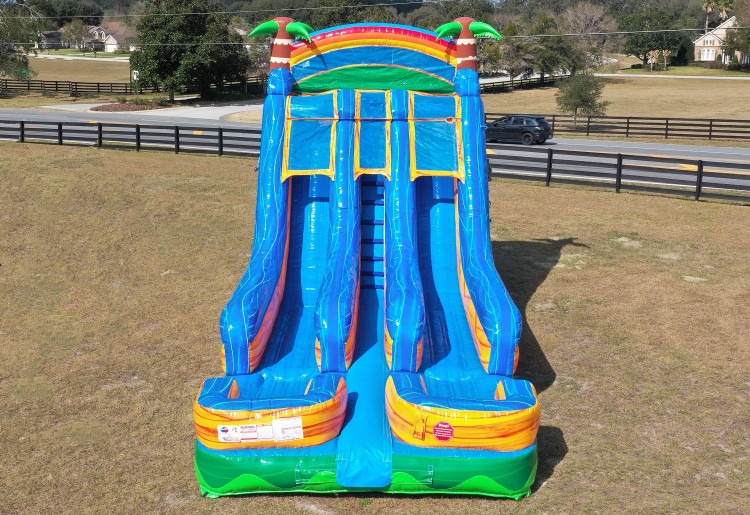 New in 2023!  The Tropical Double Lane slide allows for double the fun and has great bright colors that catches the eye!  The slide has splash pools at the bottom and not a deep pool.  This makes the slide very safe for all ages!  The slide measures 30 l x 11 w x 24 h.